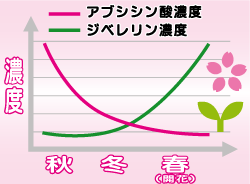 『アブシシン酸』は一定の低温状況が続くと濃度が減少し、『ジベレリン』の濃度が上昇します。その結果、種子の発芽および、花芽の開花が促進されます。